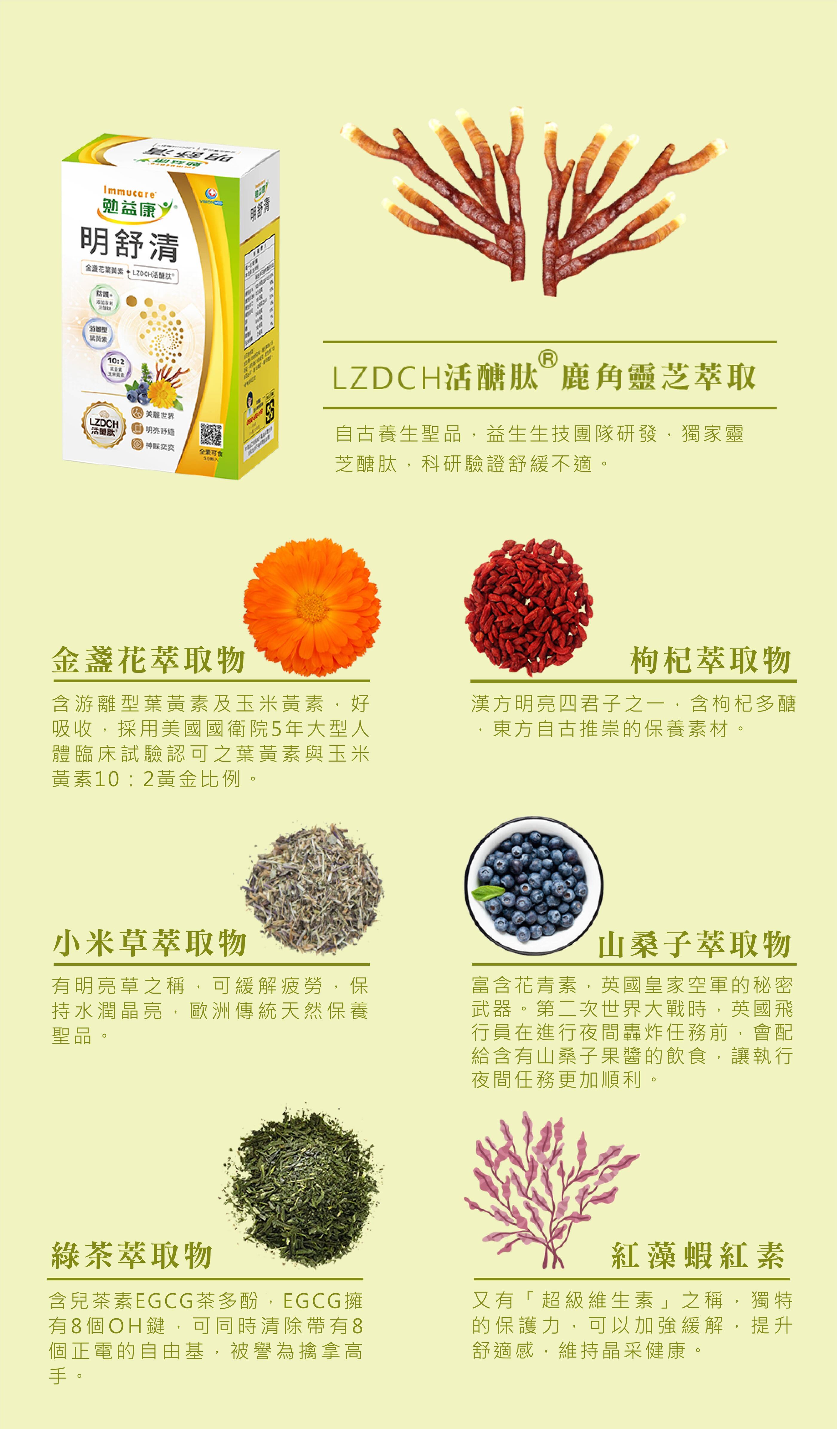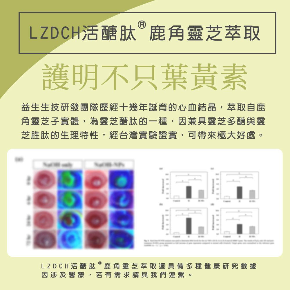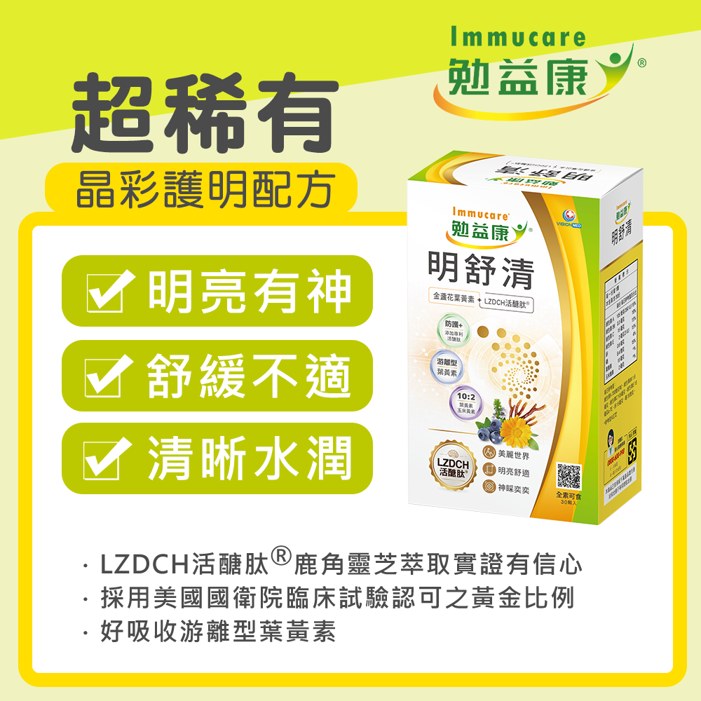 優質LZDCH活醣肽® x 葉黃素 x 玉米黃素稀有好明亮複方組合,葉黃素和玉米黃素黃金比例10:2,天然來源金盞花、紅藻、山桑子、枸杞、小米草萃取,告別霧煞煞,迎接更清晰的未來,隨時擁有晶亮世界!
