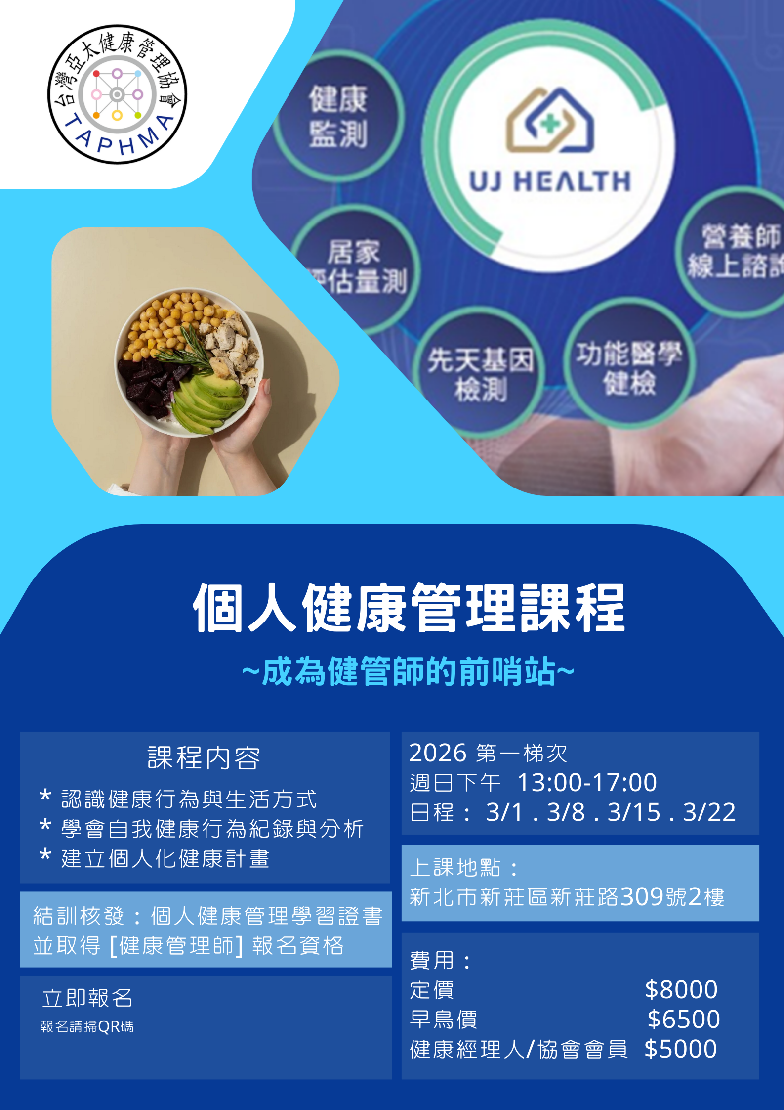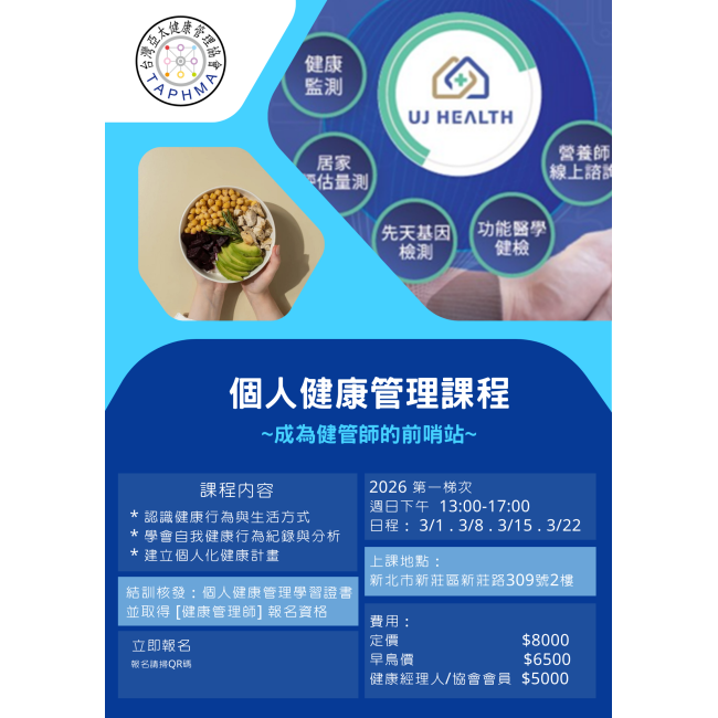 個人簡介:國中 健康教育 專任 教師 十年美國管理科技大學 健康管理碩士中華健康管理協會 健康管理師認證台灣亞太健康管理協會 健康管理師認證臺北醫學大學 健康管理從業人員 認證醫學檢驗數據判讀與整合評估 實務研習台灣健康促進暨衛生教育學會健康促進管理師認證台北市 救國團 團務委員會健康吃快樂動 客座講師台灣亞太健康管理協會 健康管理經紀人暨 講師 暨 分會長 暨 採訪組組長救國團 月走越健康 年度活動 主辦人美兆健康檢查中心 健康管理服務專員茶荷慢活坊創辦主理人..