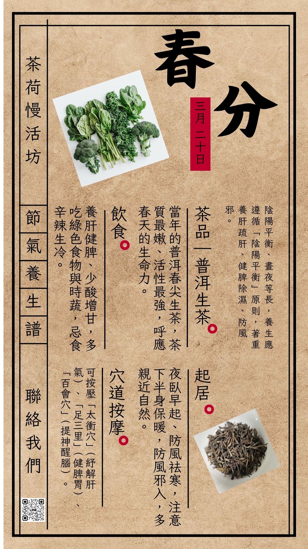 在茶飲選擇上,春分節氣特別適合飲用「當年普洱春尖生茶」。此時正值春茶初採,茶樹新芽萌發,春尖茶葉嫩度高、活性強,能充分展現春季的生命力。普洱生茶性質清新,帶有自然的鮮爽與回甘,有助於提振精神、促進代謝,同時不過於厚重,適合春季飲用。其清而有勁的特性,恰好呼應春分陰陽平衡的節氣特質,有助於身體由內而外逐步調整至穩定狀態。