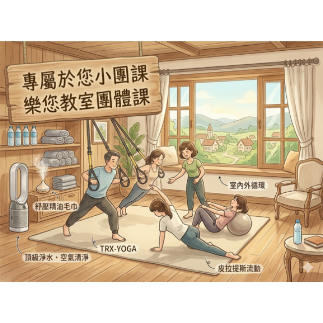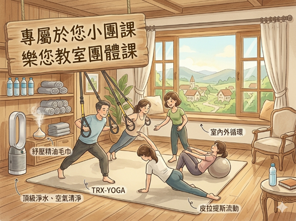 舒適木質教室空間,頂級淨水、空氣清淨、室內外循環、紓壓精油毛巾,做運動也有貴婦享受